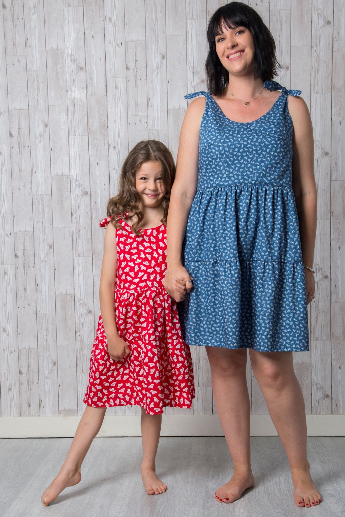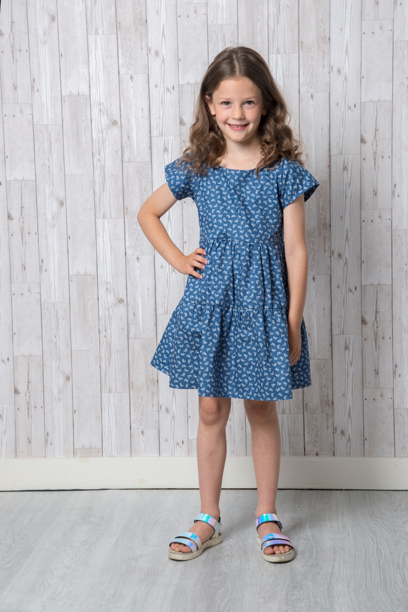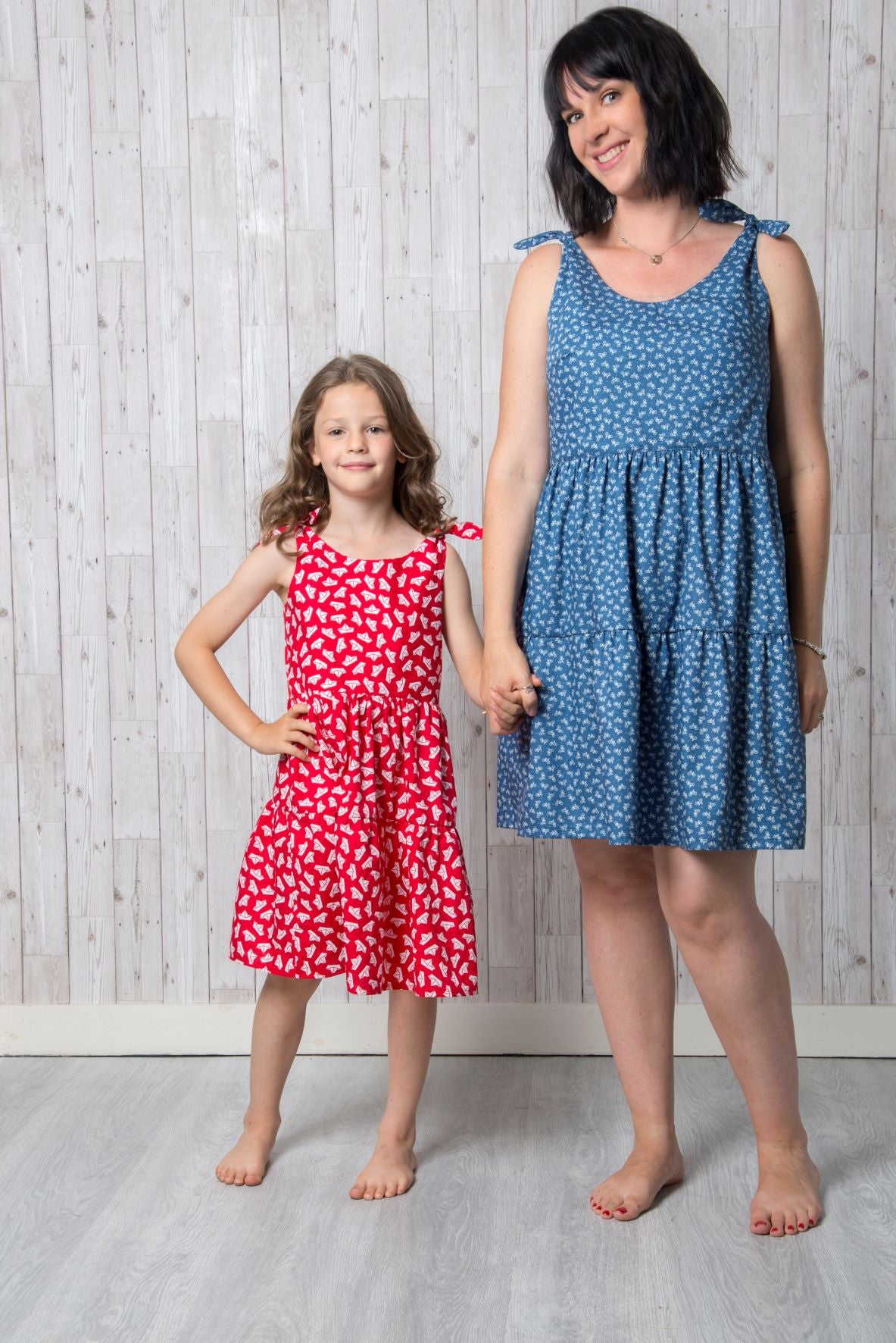 Bella is a mini-me kids summer dress based on the adult pattern Cassie dress. A t-shirt style bodice attached to gathered skirt layers gives a full, flowy effect for little girls. Chuck on some sandals and you're ready for the beach or a trip to the park. The children's dress can also be made with tie straps for a more traditional summery sundress feel. Or you can always team the t-shirt version with a cardigan and leggings for the colder months. This pattern is suitable for beginners – it features no darts or closures making it super quick!