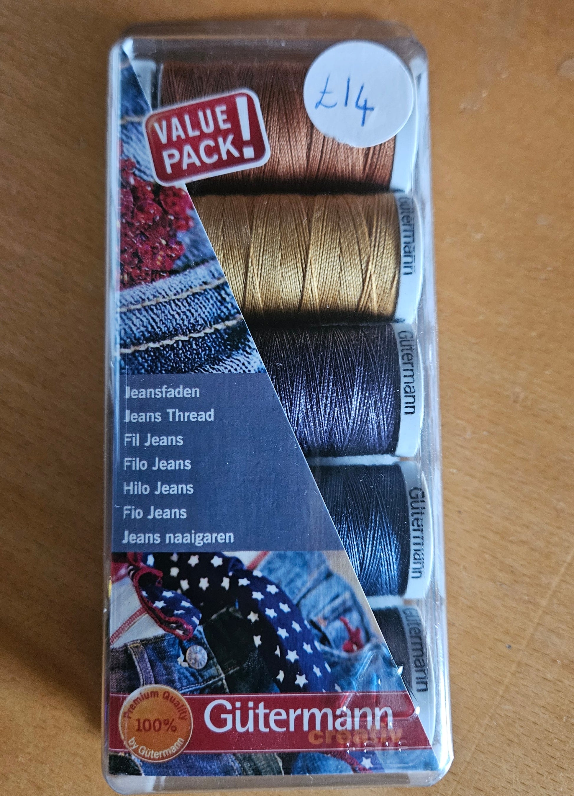 Five pack of Gutermann jeans sewing threads, containing three 100m 100% polyester extra strong threads, and two 200m 70% polyester/30% cotton threads.