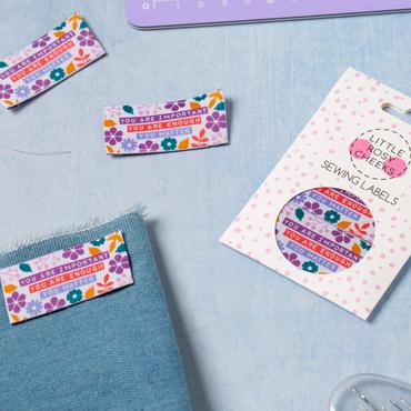 You Are Important, You Are Enough, You Matter is woven in a 'Dymo' label style font in colours of pink, coral and lilac, surrounded by flowers and foliage. This is Spring/Summer label with a very important message, one of several Little Rosy Cheeks affirmation style designs.