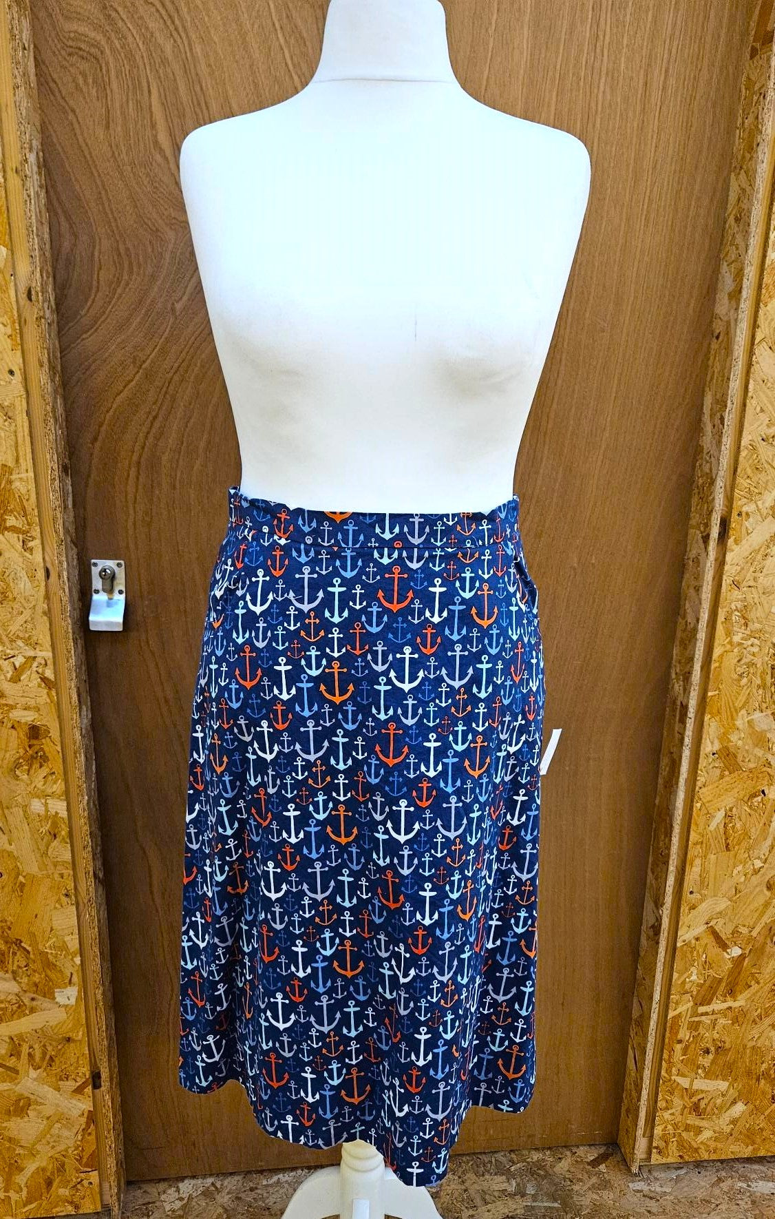 This sample a-line skirt was made as part of pattern development. It is a size 14 and features a simple a-line shape skirt with cutaway pockets at the front, a narrow waistband and a back zip. There is a hook and closure at the back. The skirt is unfinished inside. The fabric is 100% cotton featuring red, yellow, orange and white anchors on a blue background.