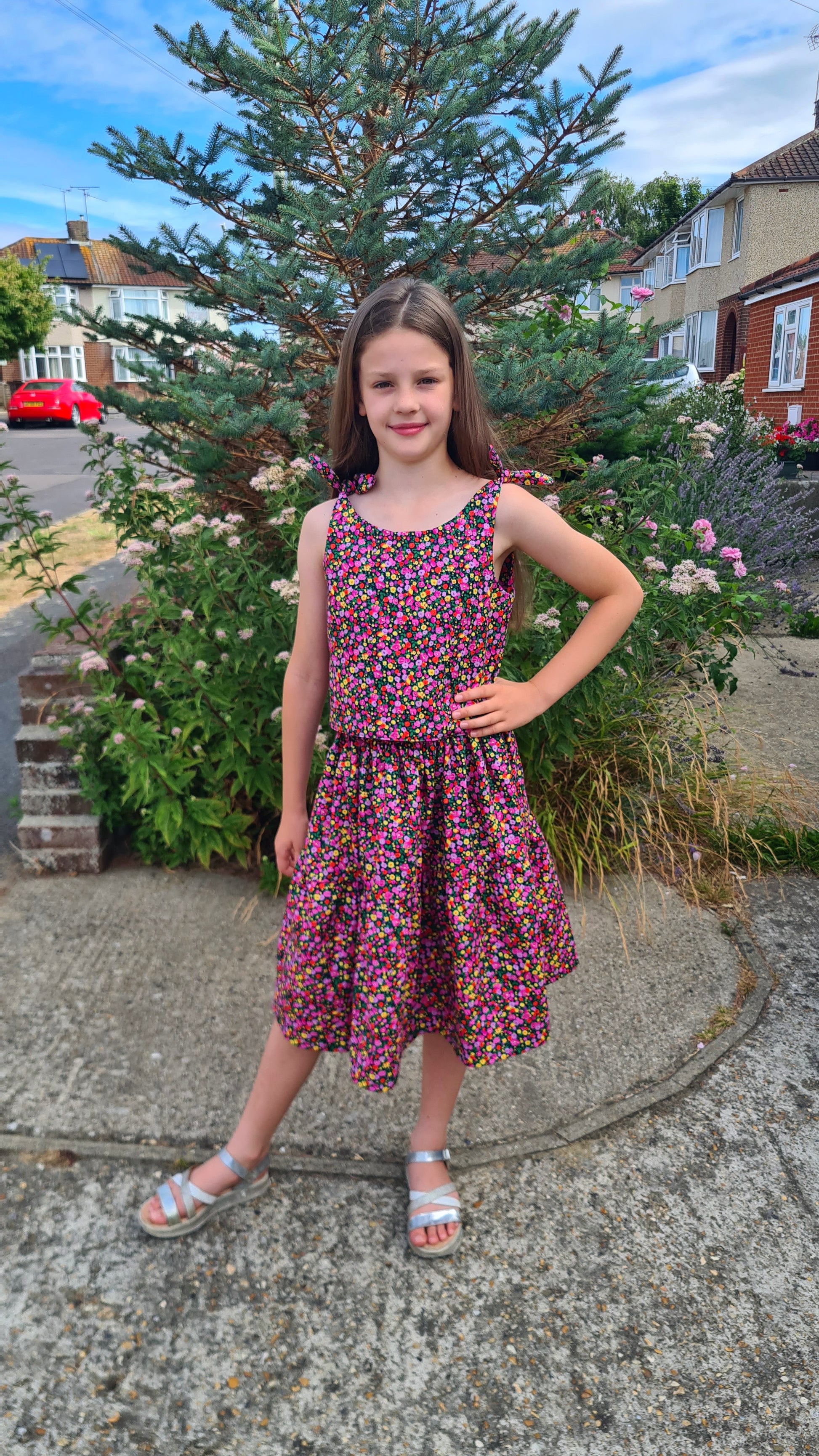 This Bella co-ord is a hacked version of the standard child's dress and was made as a sample for social media and shows. It is an age 10 and features a tie strap version of the bodice, and a gathered skirt. The top and skirt are unfinished inside. The fabric is a made from a cotton poplin of bright coloured flowers on a black background.
