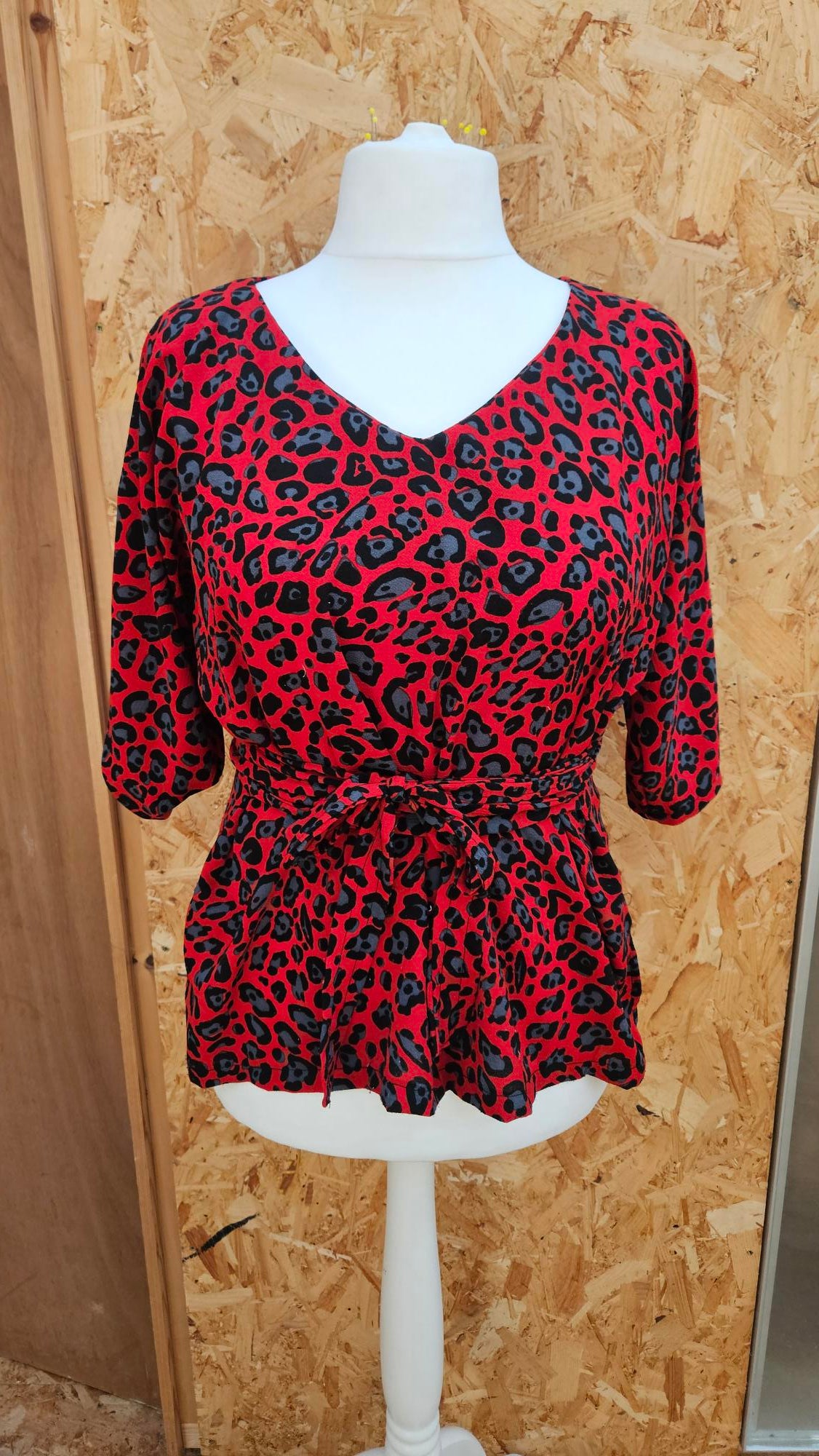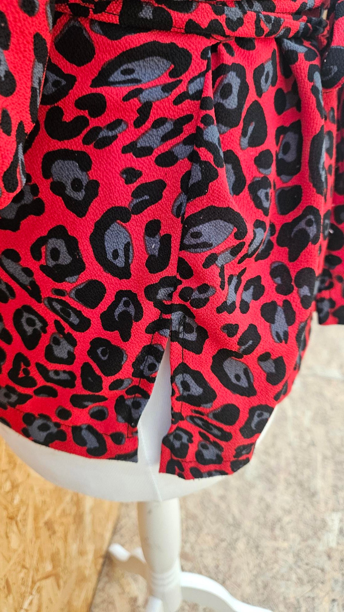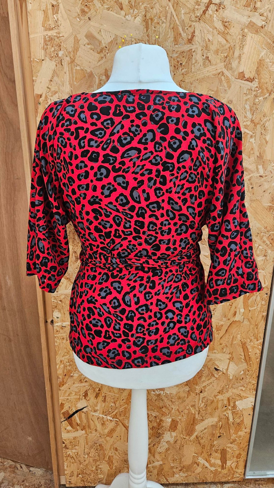 This Kobi top hack was made as a sample for a show. It is a standard Kobi top with a v neck, and attached belt - it also has side splits at the hem. The top is unfinished inside. The fabric is 100% polyester in red and blue leopard print crepe.