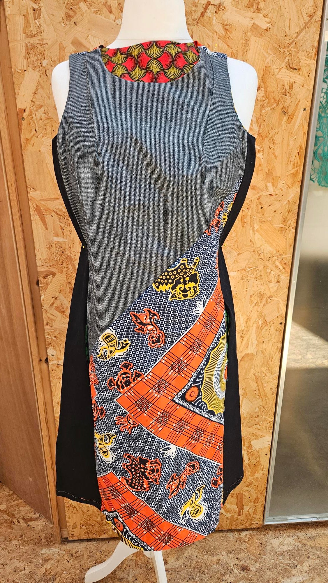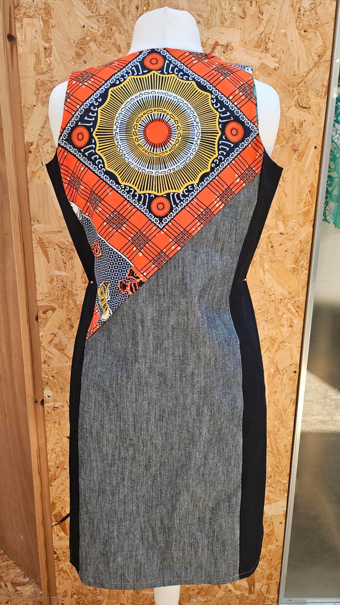 This Martha sample was made as a sample for a show and has never been worn. It is made to our size 10 and conforms to our standard Martha pattern. The dress is unfinished inside. The fabric is blue denim and Ankara cotton print in orange, black and yellow.