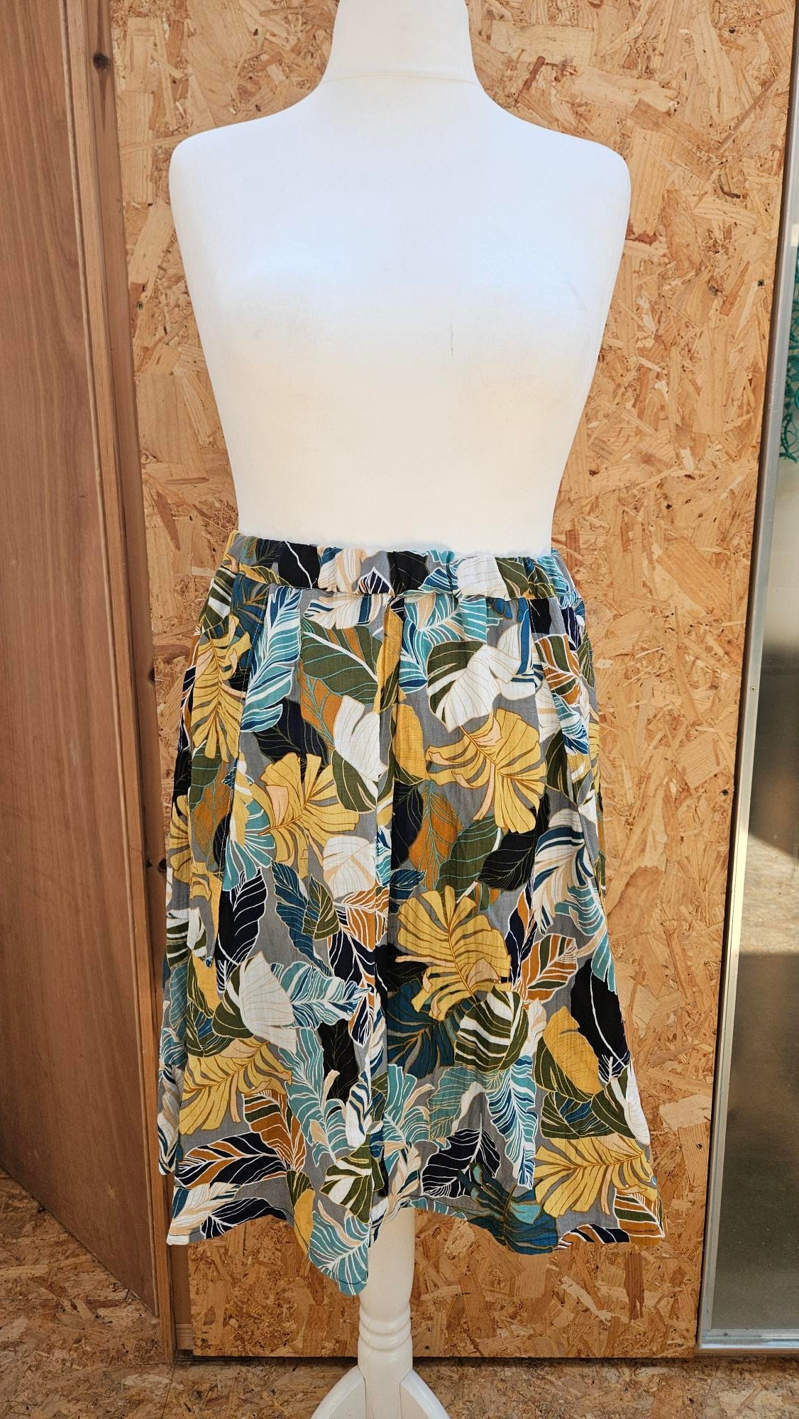 This Paloma skirt was made for a show. It is made to our standard Paloma skirt pattern with an elasticated waist. The fabric is 100% viscose and features a leaf print with green, blue, yellow and grey outlines.